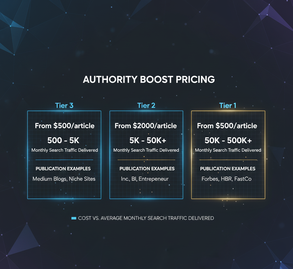 Some services offer “Author Badge” placements — your writer becomes permanent contributor with photo and bio on sites like Fast Company.